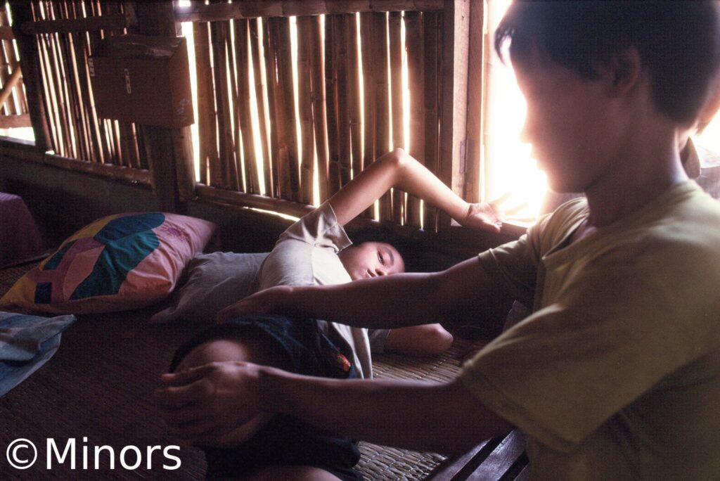 Children who were wounded by US UXO (Unexploded Ordanance) in northern Laos, a 13-year-old lost his hand and was blinded by shrapnel; two youngsters received head wound and had fingers amputated by playing with the bombs, and a boy was severely wounded in the abdomen.